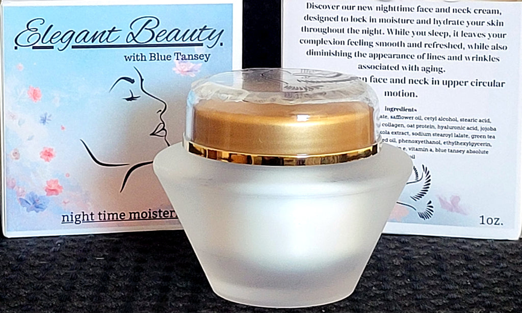 Elegant Beauty is a hydrating face and neck cream locking in moisture, bringing out a soft, youthful glow soft, hydrated morning through night. Our collagen cream reduces the appearance of lines and wrinkles, using only the finest, most effective natural ingredients. Blue Tansy essential oil is very soothing to the skin. It lends anti-inflammatory and conditioning properties for every skin type and antioxidants for rejuvenation.